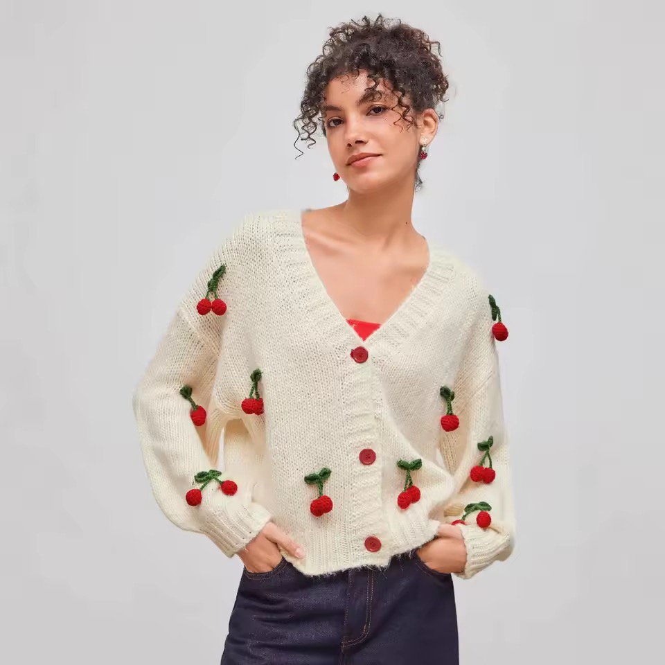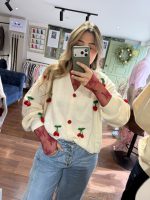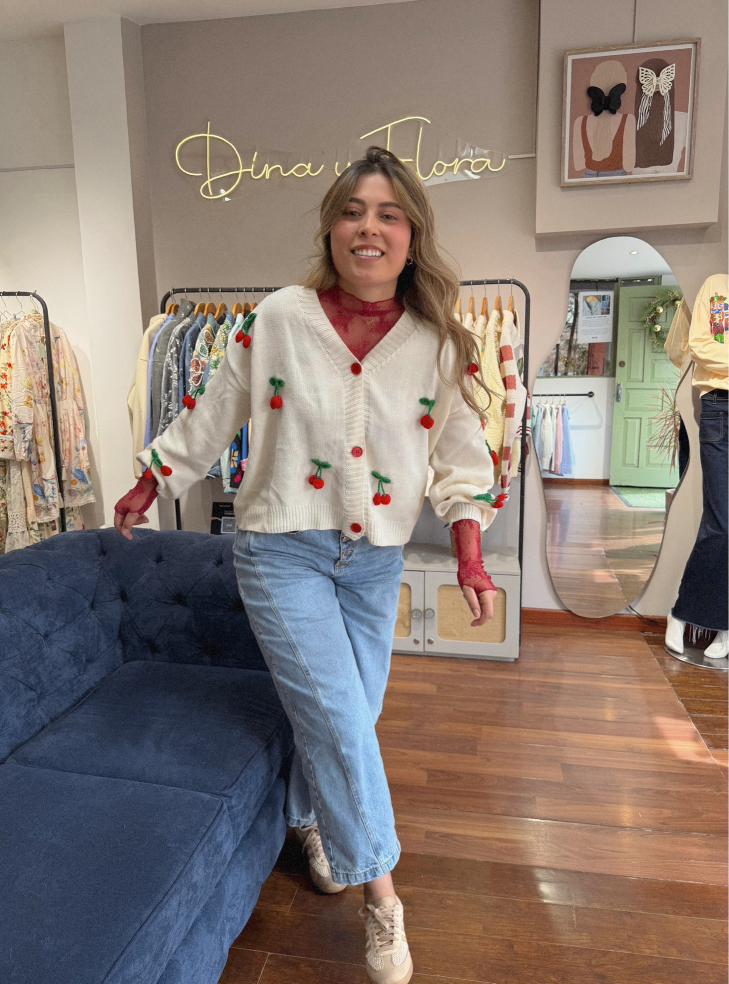 Está hecho en algodón, tejido suavecito, cómodo y con unas cerezas tejidas que cuelgan en la parte frontal y en las mangas, perfecto para elevar un look sencillo y que esta sea la pieza protagonista.