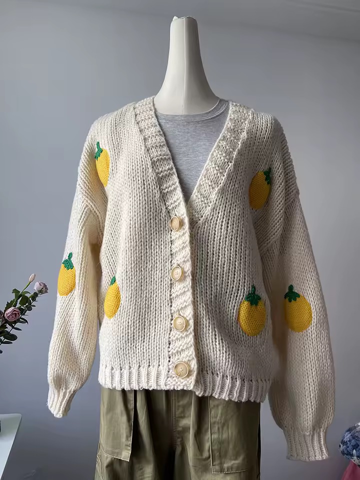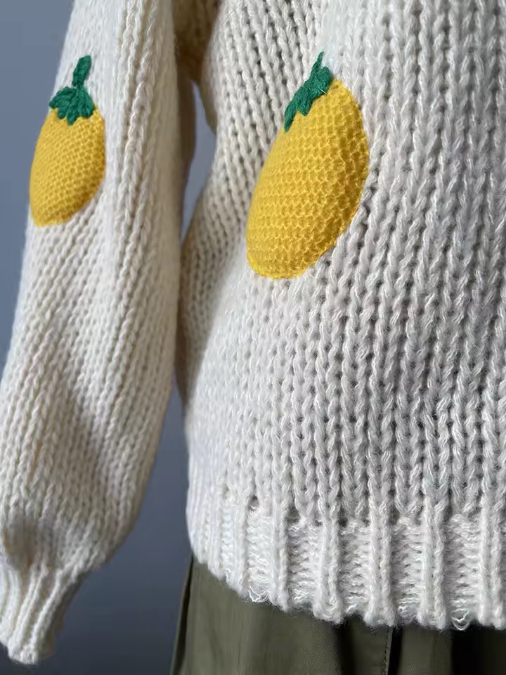 Es un saquito tejido en lana acrílica, suavecito, calentito y con limones bordados que le dan un aire fresco y alegre, es perfecto para darle vida a tus outfits diarios. La horma es cómoda, amplia y fácil de combinar.