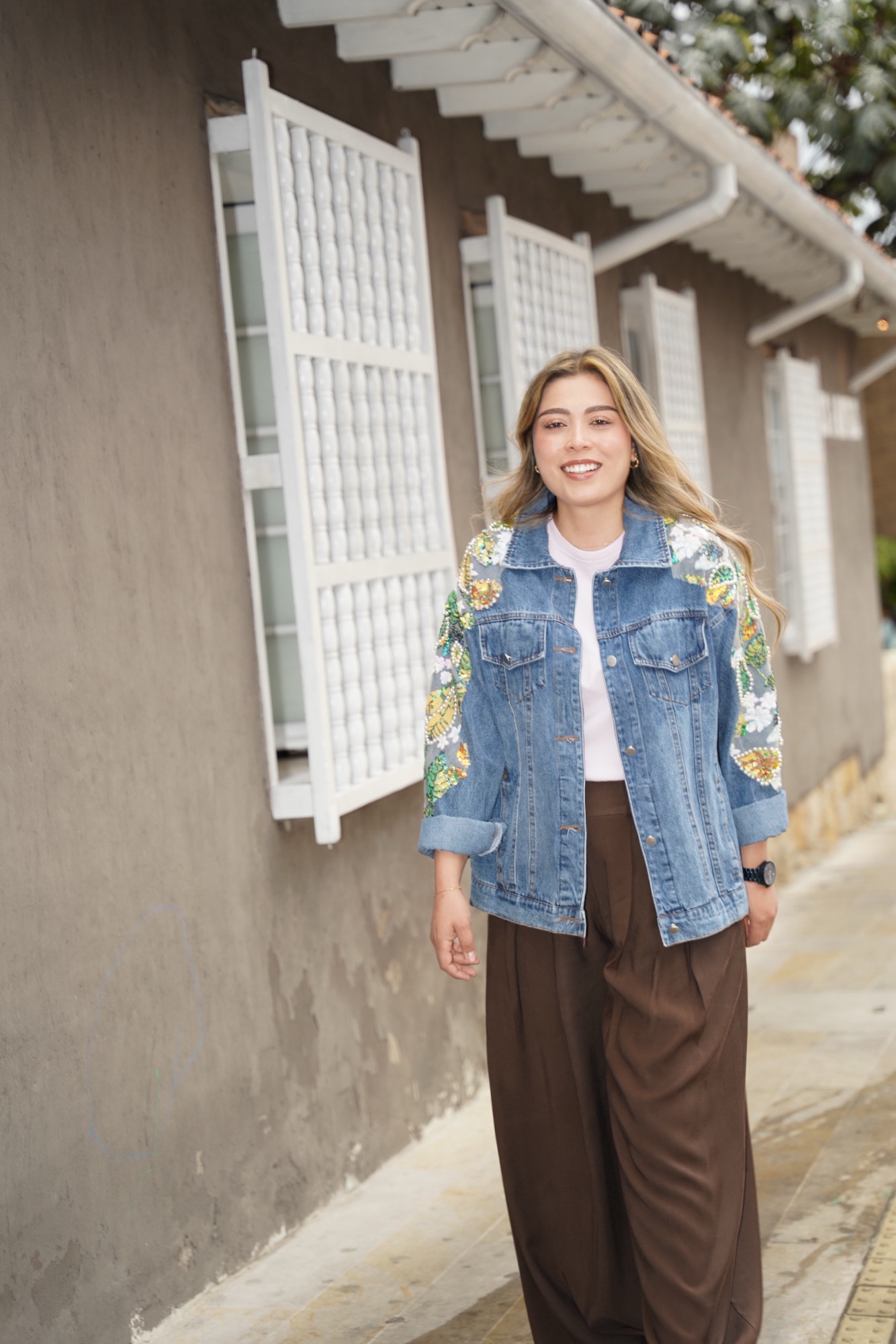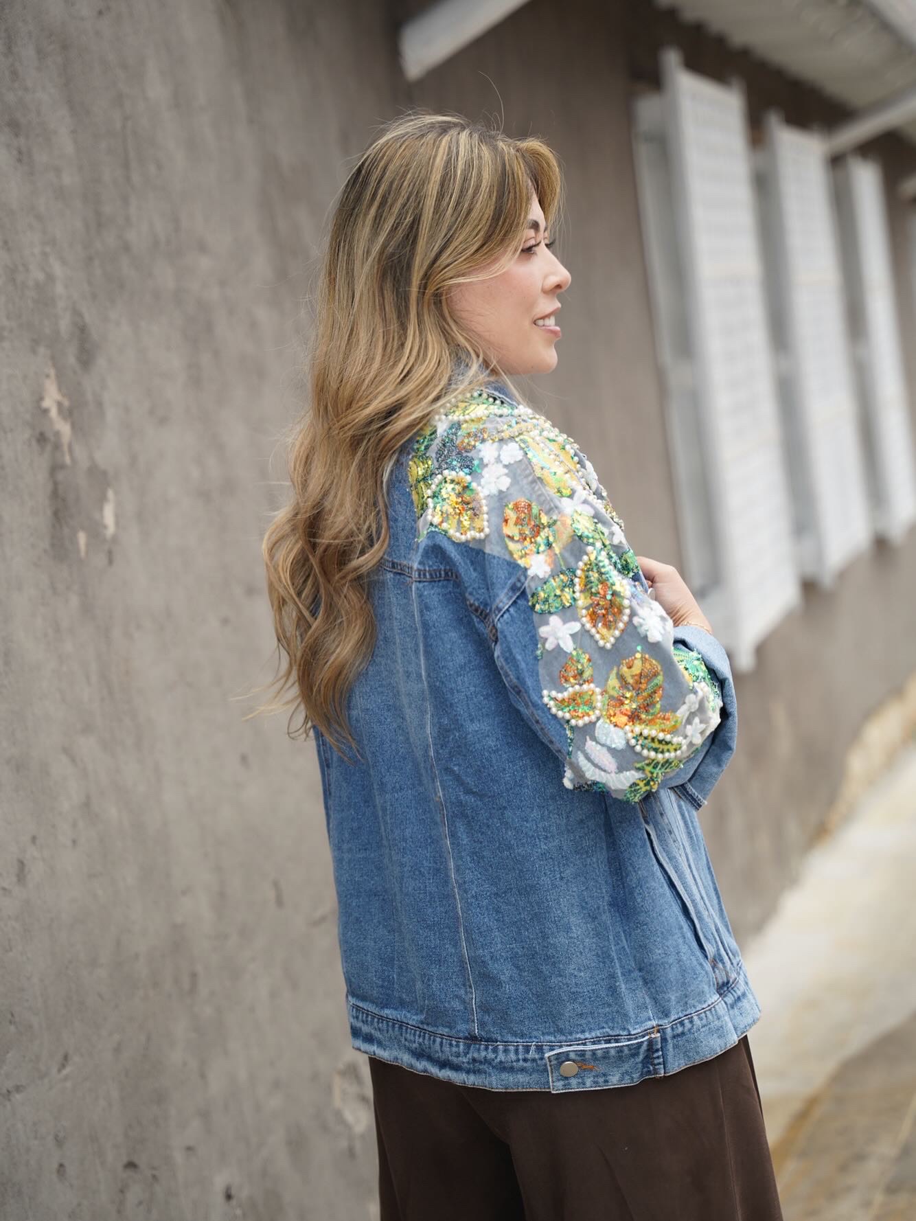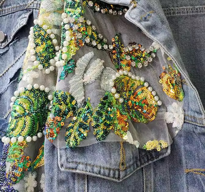 Está hecha en denim tono medio, de horma amplia, bordadita con lentejuelas y pedrería (puedes elegirla en tonos verdes o en tonos rosados) para que elijas la que más combine con tus looks.