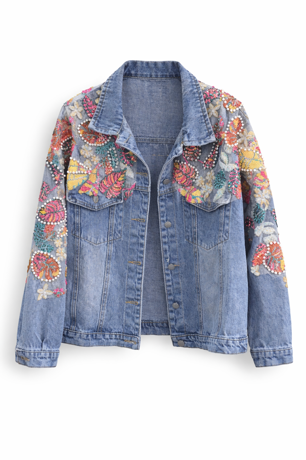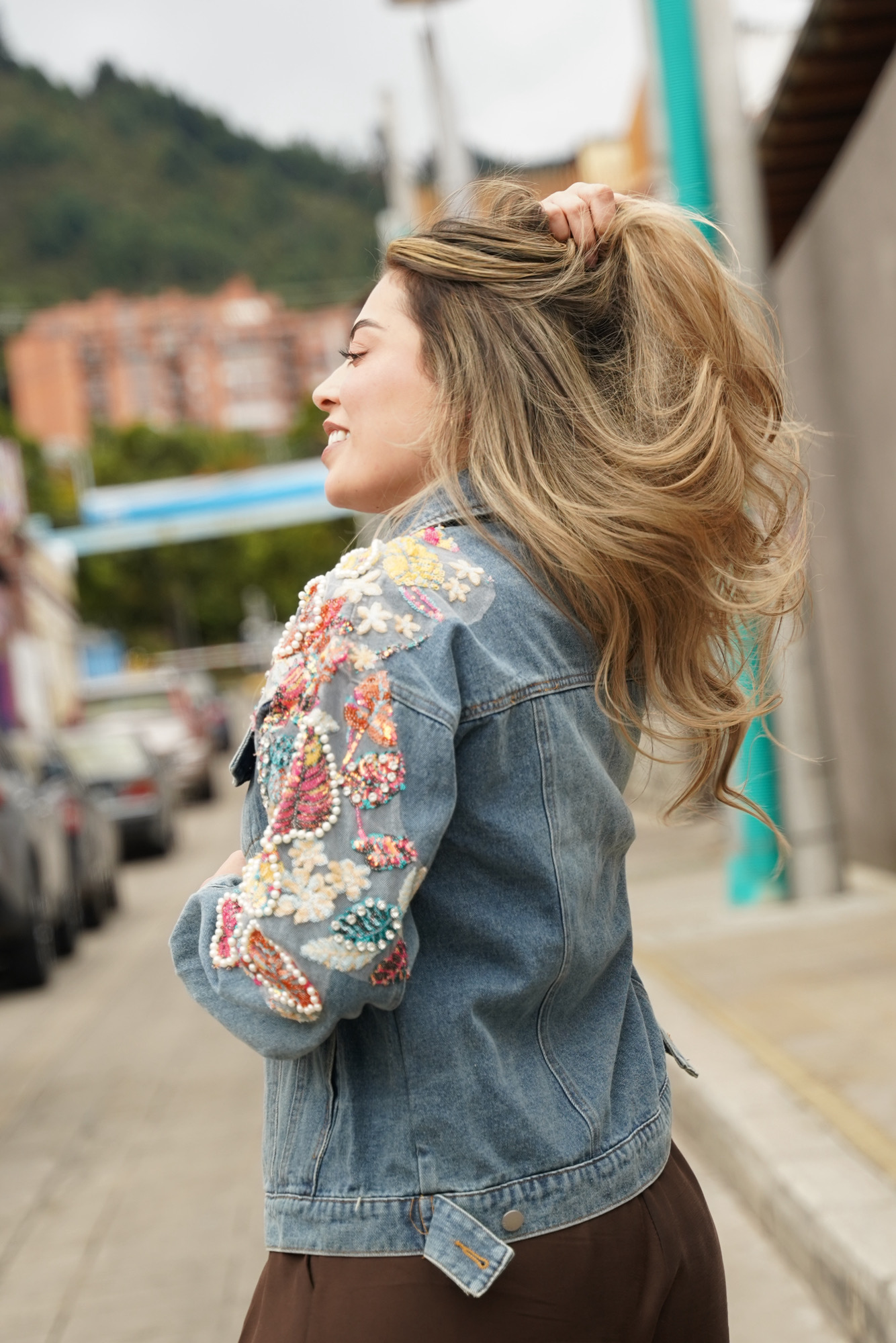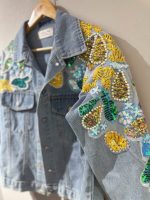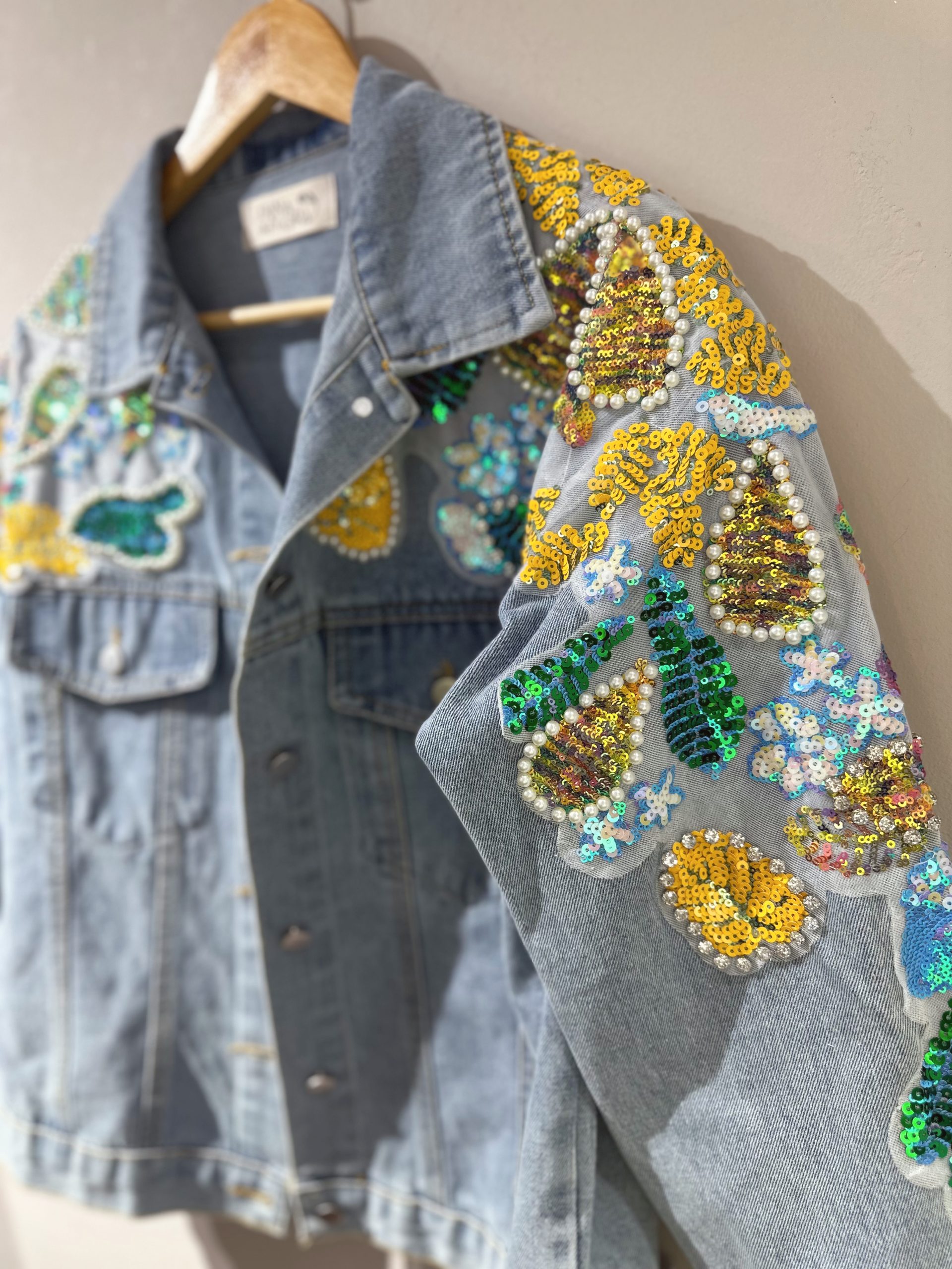 Está hecha en denim tono medio, de horma amplia, bordadita con lentejuelas y pedrería (puedes elegirla en tonos verdes o en tonos rosados) para que elijas la que más combine con tus looks.